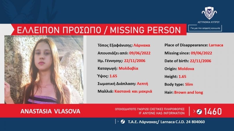 Παρακαλείται οποιοσδήποτε γνωρίζει οτιδήποτε που μπορεί να βοηθήσει στον εντοπισμό της, να επικοινωνήσει με το ΤΑΕ Λάρνακας, στο τηλέφωνο 24-804060 ή με τον πλησιέστερο Αστυνομικό Σταθμό ή με τη Γραμμή του Πολίτη, στο τηλέφωνο 1460.