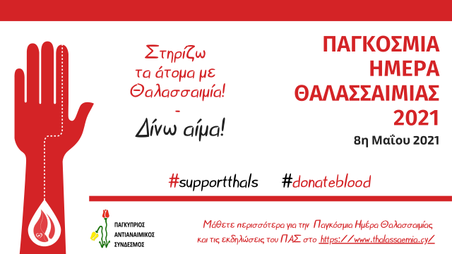Ο Παγκύπριος Αντιαναιμικός Σύνδεσμος, αυτή την σημαδιακή μέρα θέλει να ευχαριστήσει ιδιαίτερα εκείνους τους επαγγελματίες υγείας των Κέντρων Θαλασσαιμίας που στάθηκαν και στέκονται πιστοί στο καθήκον και τον όρκο τους, το προσωπικό του Κέντρου και των Τραπεζών Αίματος αλλά και όλους τους αιμοδότες οι οποίοι με την προσφορά τους, δίνουν στο δικαίωμα σε όλα τα άτομα με θαλασσαιμία να συνεχίσουν να ζουν μια φυσιολογική ζωή.