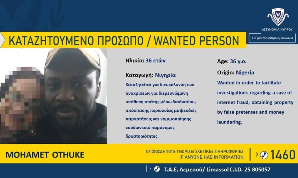 Η Αστυνομία καταζητεί τον Mohamet Othuke, 36 χρόνων από τη Νιγηρία, σε σχέση με διερευνώμενη υπόθεση απάτης μέσω διαδικτύου, απόσπασης περιουσίας με ψευδείς παραστάσεις και νομιμοποίησης εσόδων από παράνομες δραστηριότητες, που διαπράχθηκε στη Λεμεσό μεταξύ των ημερομηνιών 19/5/2022 – 2/7/2022.