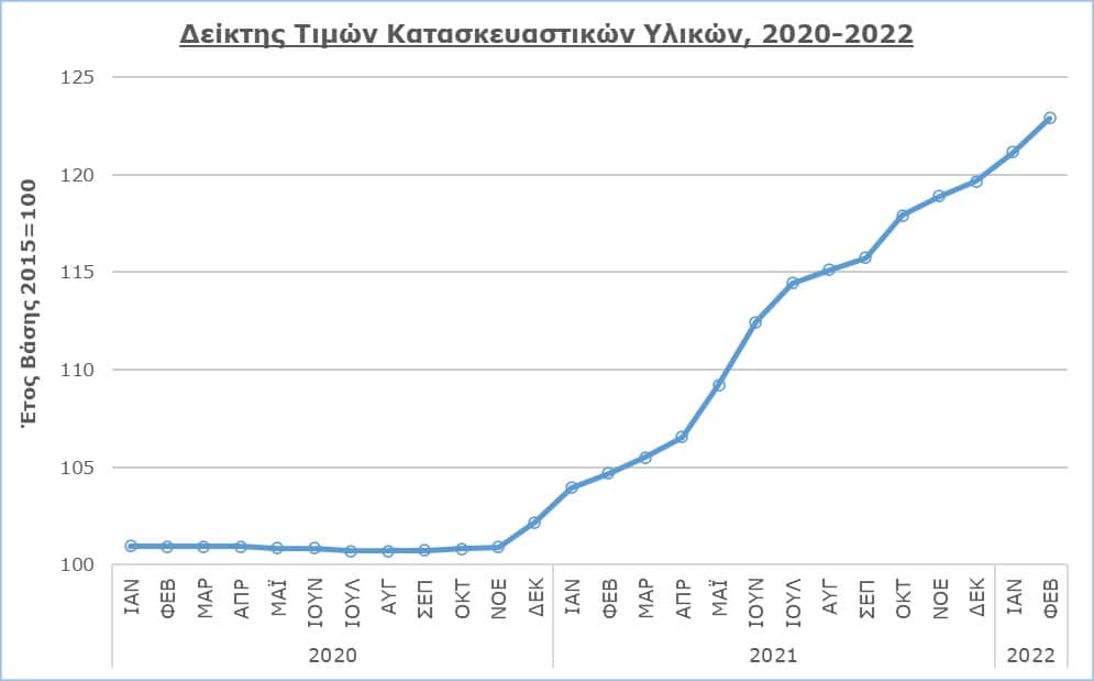 Ο Δείκτης Τιμών Κατασκευαστικών Υλικών για τον μήνα Φεβρουάριο 2022 ανήλθε στις 122,92 μονάδες (με βάση 2015=100), σημειώνοντας αύξηση της τάξης του 1,44% σε σχέση με τον προηγούμενο μήνα.