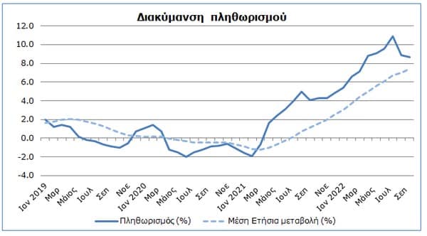 Για την περίοδο Ιανουαρίου – Σεπτεμβρίου 2022 σε σύγκριση με την αντίστοιχη περσινή περίοδο, οι μεγαλύτερες μεταβολές παρουσιάστηκαν στις κατηγορίες Στέγαση, Ύδρευση, Ηλεκτρισμός και Υγραέριο (21,9%) και Μεταφορές (18,3%).