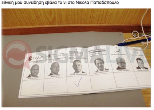 Δυο απ΄ αυτά τα οποία δημοσιεύονται πιο κάτω χωρίς να φαίνονται περαιτέρω στοιχεία των ατόμων που προχώρησαν στις αναρτήσεις, αναγράφουν το ένα, την ψήφο στον Νικόλα Παπαδόπουλο και το άλλο το οποίο και προφανώς είναι άκυρο, καταγράφει μερικούς απ΄τους λόγους που ακυρώθηκε το ψηφοδέλτιο.
