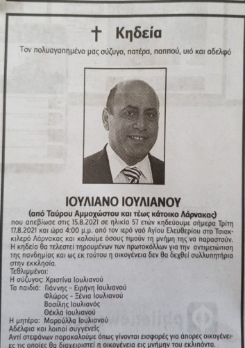 Θλίψη σκόρπισε η είδηση του θανάτου του 57χρονου Ιουλιανού Ιουλιανού, ο οποίος έχασε τη μάχη με τον κορωνοϊό.