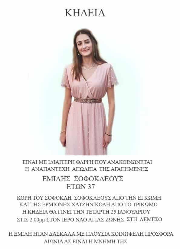 Θλίψη σκόρπισε η είδηση του χαμού της της 37χρονης Έμιλυς Σοφοκλέους από την Λεμεσό.