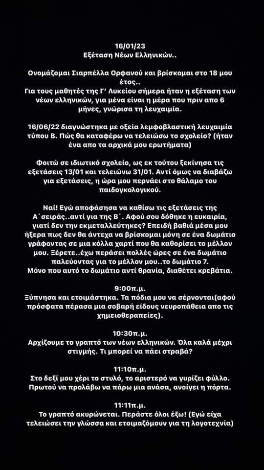 Σύμφωνα με την ανάρτηση της 18χρονης Σιαρπέλλας, για τους μαθητές της τρίτης Λυκείου σήμερα ήταν η εξέταση των νέων ελληνικών και για την ίδια είναι η μέρα που πριν από έξι μήνες διαγνώστηκε με λευχαιμία.