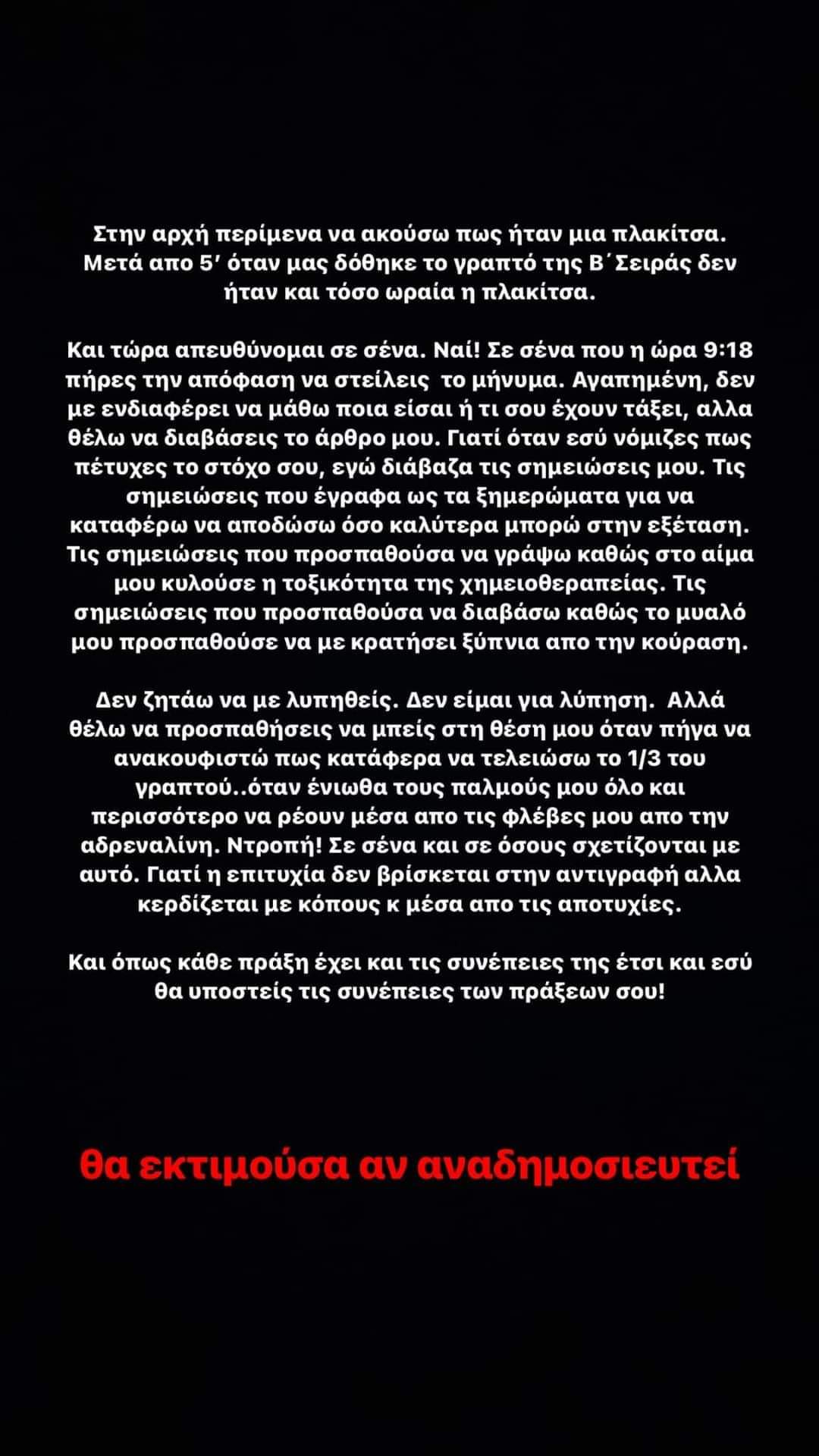 «Και τώρα απευθύνομαι σε εσένα. Ναι! Σε σένα που η ώρα 9:18 πήρες την απόφαση να στείλεις το μήνυμα. Αγαπημένη, δεν με ενδιαφέρει να μάθω ποια είσαι η τι σου έχουν τάξει, αλλά θέλω να διαβάσεις το άρθρο μου. Γιατί όταν εσύ νόμιζες πως τον πέτυχες τον στόχο σου, εγώ διάβαζα τις σημειώσεις που έγραφα μέχρι τα ξημερώματα για να καταφέρω να αποδώσω όσο καλύτερα μπορώ στην εξέταση. Τις σημειώσεις που προσπαθούσα να γράψω καθώς στο αίμα μου κυλούσε η τοξικότητα της χημειοθεραπείας. Τις σημειώσεις που προσπαθούσα να διαβάσω καθώς το μυαλό μου προσπαθούσε να με κρατήσει ξύπνια από την κούραση. Δε ζητάω να με λυπηθείς, δεν είμαι για λύπηση, αλλά θέλω να προσπαθήσεις να μπεις στη θέση μου όταν πήγα να ανακουφιστώ πως κατάφερα να τελειώσω το ένα τρίτο του γραπτού. Όταν ένιωθα τους παλμούς μου όλο και περισσότερο να ρέουν μέσα από τις φλέβες μου από την αδρεναλίνη. Ντροπή! Σε σένα και σε όσους σχετίζονται με αυτό. Γιατί η ευτυχία δεν βρίσκεται στην αντιγραφή αλλά κερδίζεται με κόπους και μέσα από τις αποτυχίες. Και όπως κάθε πράξη έχετε και τις συνέπειες της έτσι κι εσύ θα υποστείς τις συνέπειες των πράξεων σου», καταλήγει.