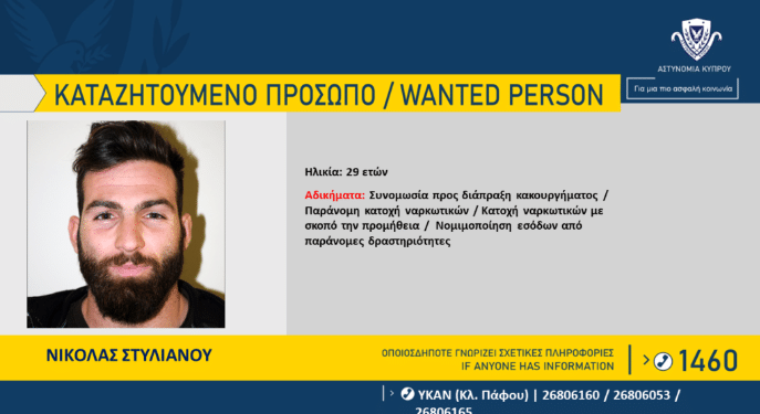 Η Αστυνομία ζητά πληροφορίες, που μπορούν να βοηθήσουν στον εντοπισμό του Νικόλα Στυλιανού, 29 ετών, από την Πάφο, για διευκόλυνση των ανακρίσεων, σε σχέση με υπόθεση που αφορά τα αδικήματα της συνομωσίας προς διάπραξης κακουργήματος, παράνομης κατοχής ναρκωτικών, κατοχής ναρκωτικών με σκοπό την προμήθεια και νομιμοποίησης εσόδων από παράνομες δραστηριότητες.