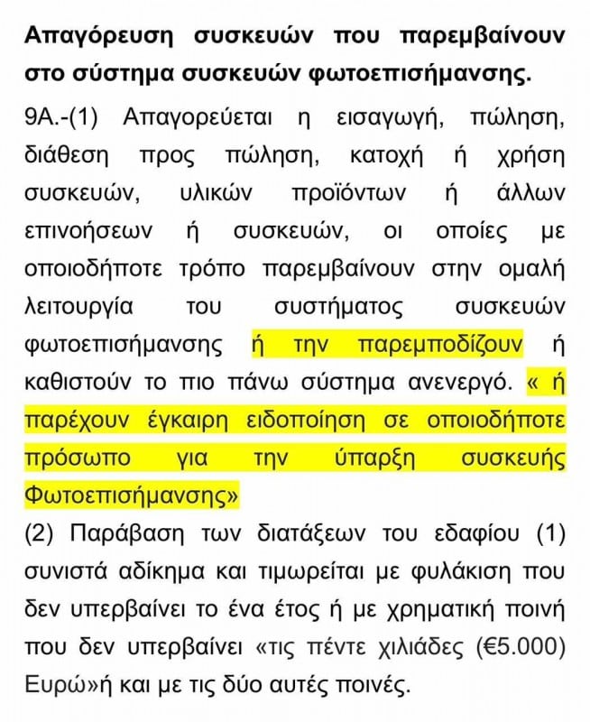 Στο νομοσχέδιο που ετοίμασε το υπουργείο Μεταφορών, το οποίο αναμένεται να κατατεθεί προσεχώς για κατ’ άρθρο συζήτηση στη Βουλή των Αντιπροσώπων, περιλήφθηκε λεκτικό, το οποίο, όπως ανέφερε ο υπουργός, στοχεύει στην κάλυψη των κενών που υπάρχουν στη νομοθεσία, όσον αφορά σε όσους επινοούν διάφορα για να παρενοχλούν καθ’ οιονδήποτε τρόπο τις κάμερες, στέκονται μπροστά τους κ.λπ.