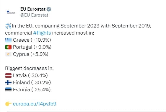 Όσον αφορά τώρα στις χώρες με τη μεγαλύτερη μείωση πτήσεων το Σεπτέμβριο του 2023 σε σύγκριση πάντα με τον Σεπτέμβριο του 2019, στην πρώτη θέση κατατάσσεται η Λετονία με μείωση η οποία φτάνει στο 30,4%. Ακολουθεί στη δεύτερη θέση η Φινλανδία με τη μείωση να αγγίζει το 30,2% και στην τρίτη θέση βρίσκεται η Εσθονία με μείωση της τάξης τους 25,4%.