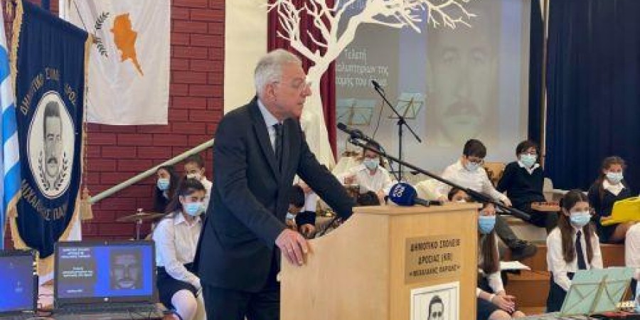 Ο Υπουργός εξέφρασε «ικανοποίηση» για τη σημερινή «ιστορική» όπως τη χαρακτήρισε στιγμή των αποκαλυπτηρίων της προτομής του ήρωα και μετέφερε τον θερμό χαιρετισμό του Προέδρου της Δημοκρατίας. «Με το όνομα του και μόνο, το όνομα του ήρωα από την Αναφωτία, το σχολείο αυτό δίνει το πρώτο μάθημα στα παιδιά μας, μάθημα ιστορίας και ελευθερίας, μάθημα αυτοσεβασμού και εθνικής αυτογνωσίας, το μάθημα που μας παρέδωσαν τα νιάτα της Κύπρου από το 1955 – 1959 και ανάμεσα τους ξεχωριστά ο Μιχαλάκης Παρίδης», σημείωσε.