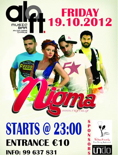 To δημοφιλές νεανικό συγκρότημα Nigma υποδέχεται το Aloft Music Bar στην Αγία Νάπα αύριο Παρασκευή με το πρόγραμμα να ξεκινάει στις 11:00 το βράδυ.