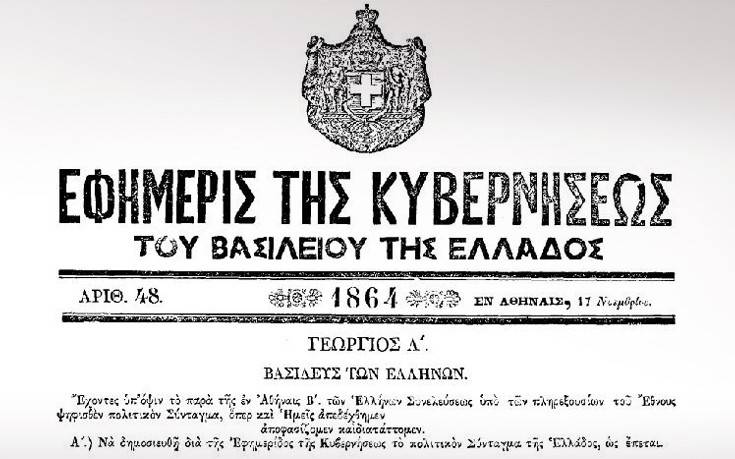 1864: Δημοσιεύεται το νέο Σύνταγμα της Ελλάδας. Καταργείται η Συνταγματική Μοναρχία και καθιερώνεται η Βασιλευόμενη Δημοκρατία.