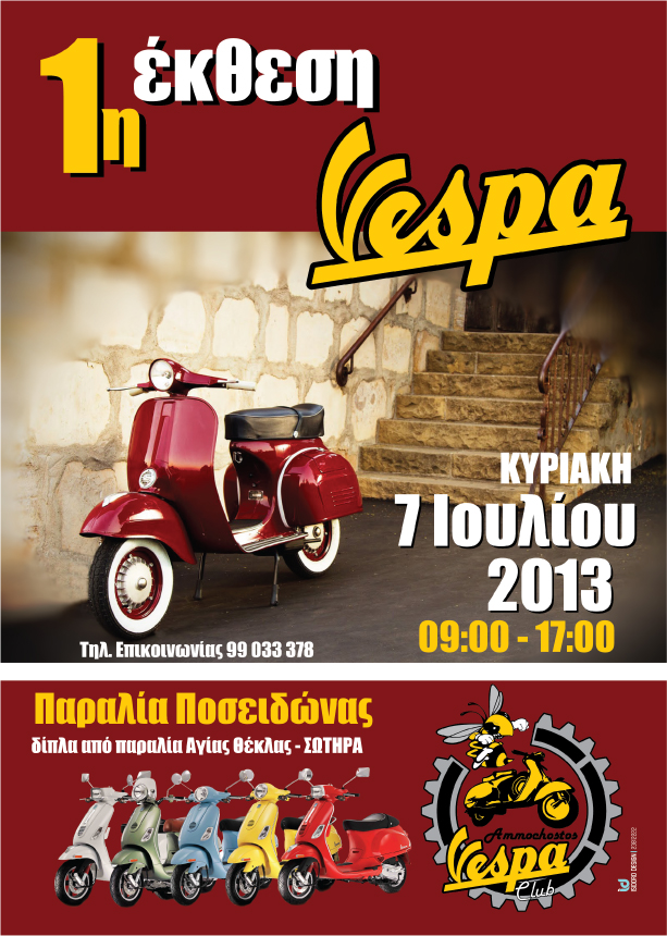 Η Έκθεση της Vespa εντάσσεται στα πλαίσια του Beach Event του Ονήσιλου Σωτήρας που θα διεξαχθεί την Κυριακή, 7 Ιουλίου από τις 9 το πρωί μέχρι αργά το βράδυ στην παραλία Ποσειδώνας στη Σωτήρα.