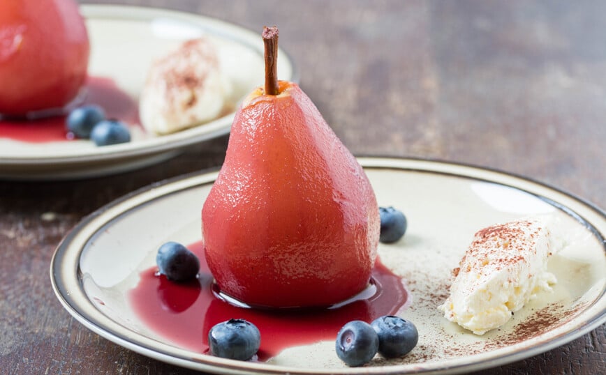Μόλις κρυώσει το σιρόπι, περιχύστε τα αχλάδια, καλύψτε και τοποθετήστε στο ψυγείο για τουλάχιστον 2 ώρες πριν τα σερβίρετε.