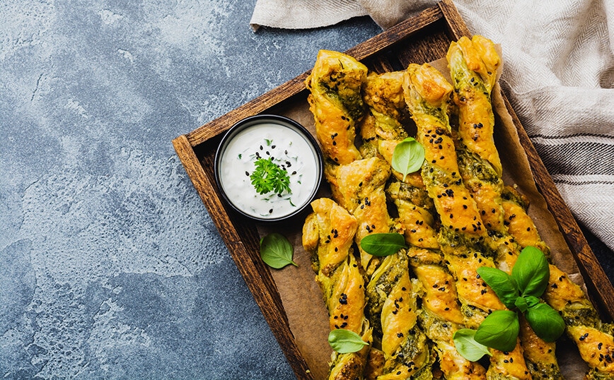 Ανοίξτε το ένα φύλλο σφολιάτας και απλώστε το πέστο ομοιόμορφα σε όλη την επιφάνειά του, αφήνοντας λίγο κενό στις άκρες.