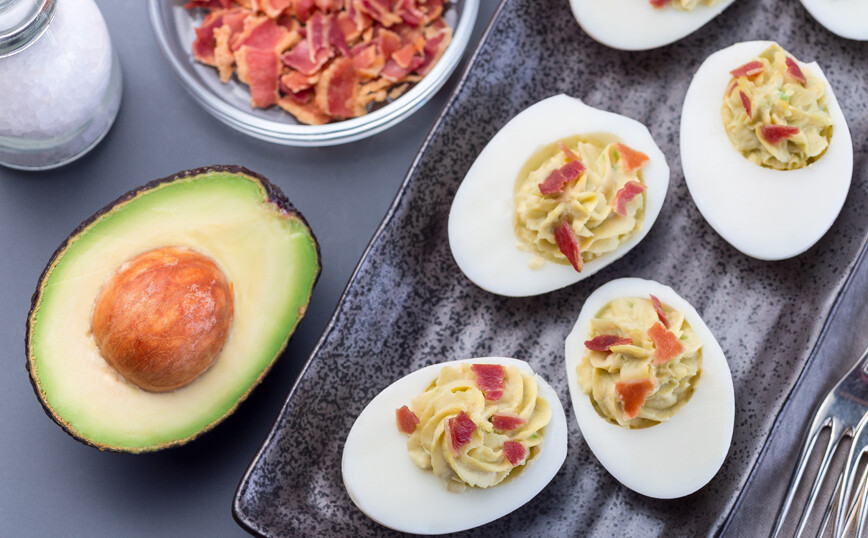 Λιώστε με ένα πιρούνι το αβοκάντο σε ένα μπολ και προσθέστε το ψιλοκομμένο μπέικον, τους κρόκους των αβγών, τη μαγιονέζα, τη μουστάρδα και το χυμό λάιμ και ανακατέψτε.