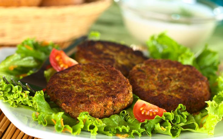 5. Απλώνετε σε ταψί λαδόκολλα και αφού πλάσετε τα μπιφτέκια τα περνάτε από τη φρυγανιά, τα βάζετε στο ταψί και ψήνετε περίπου για 15 λεπτά (μέχρι να ροδίσουν ελαφρώς).