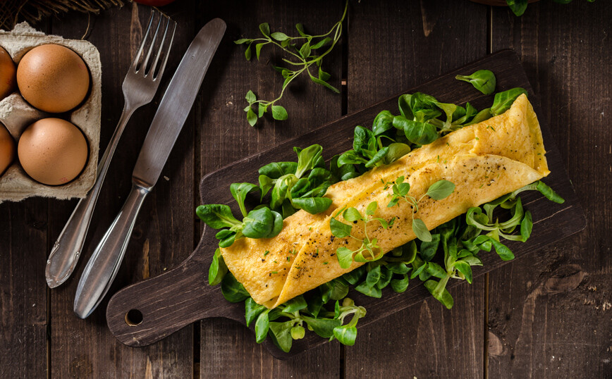 Αναποδογυρίστε την ομελέτα και τοποθετήστε την σε ένα πιάτο με τη «ραφή» προς τα κάτω.