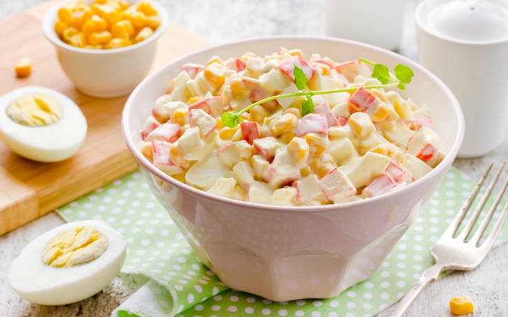 1. Ψιλοκόβετε το σουρίμι και σε ένα μπολ ρίχνετε το κρεμμύδι, την κάπαρη, τη ντομάτα, το καλαμπόκι, το μαϊντανό, το σουρίμι και τα αυγά.