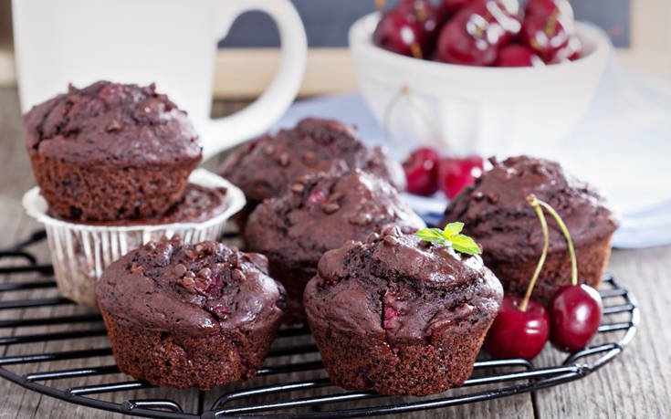 6. Βάζουμε 3-4 κεράσια σε κάθε φόρμα με τη ζύμη. Ψήνουμε για περίπου 15-18 λεπτά στους 200 ° C.