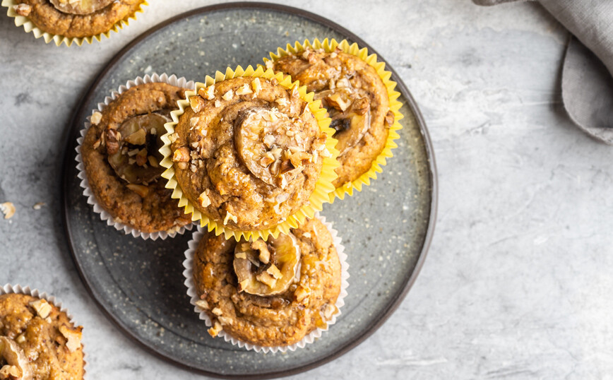 Για τη γαρνιτούρα με φυστικοβούτυρο, ανακατέψτε το μέλι με το φυστικοβούτυρο και το γάλα αμυγδάλου και γαρνίρετε τα μάφιν, συμπληρώνοντας με θρυμματισμένα φιστίκια (προαιρετικά).