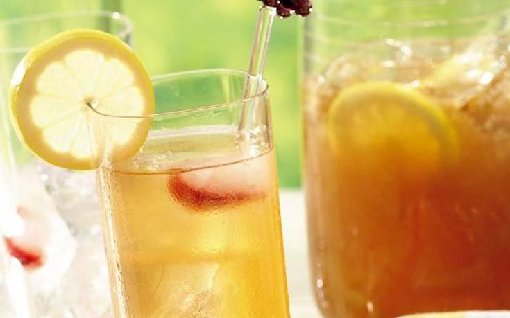 3. Βάζετε το ρόφημα σε κανάτα, προσθέτετε τα παγάκια και τις φέτες λεμονιού.