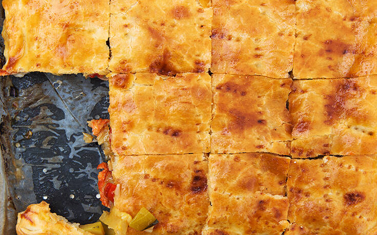 9. Αλείψτε με το τρίτο αβγό, κάντε στο φύλλο τρύπες με ένα πιρούνι και πασπαλίστε με λίγο σουσάμι (προαιρετικά).