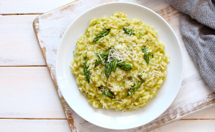 Τα μυστικά για το τέλειο ριζότο είναι λίγα και καλά: αφήστε το ρύζι να μαγειρευτεί με τα σκληρά κοτσάνια του σπαραγγιού για μερικά λεπτά παραπάνω, προκειμένου το σπαράγγι να «ποτίσει» το ρύζι, ενώ το του πρέπει να σιγομαγειρευτεί σε πολύ χαμηλή φωτιά απλά για να μαραθεί, χωρίς να πάρει χρώμα ή να ροδίσει και πάντα χωριστά από το ρύζι.
