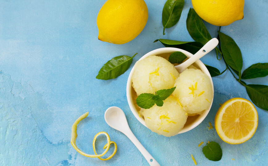 Σερβίρετε τις μπάλες σορμπέ με ξύσμα λεμονιού και φρέσκο βασιλικό.
