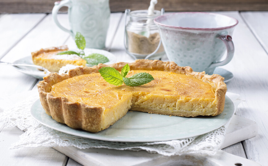 Ρίξτε την κρέμα στην προψημένη τάρτα και ψήστε σε προθερμασμένο φούρνο στους 180 βαθμούς για περίπου 6 λεπτά.