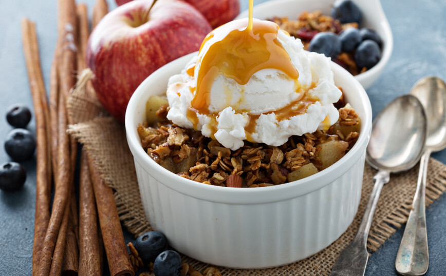 Προσθέστε την υπόλοιπη κρέμα καραμέλας, ανακατέψτε και απλώστε πάνω από το μείγμα των μήλων.
