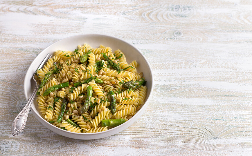 Σουρώστε και τοποθετήστε τα ζυμαρικά με τα σπαράγγια σε ένα μεγάλο μπολ.